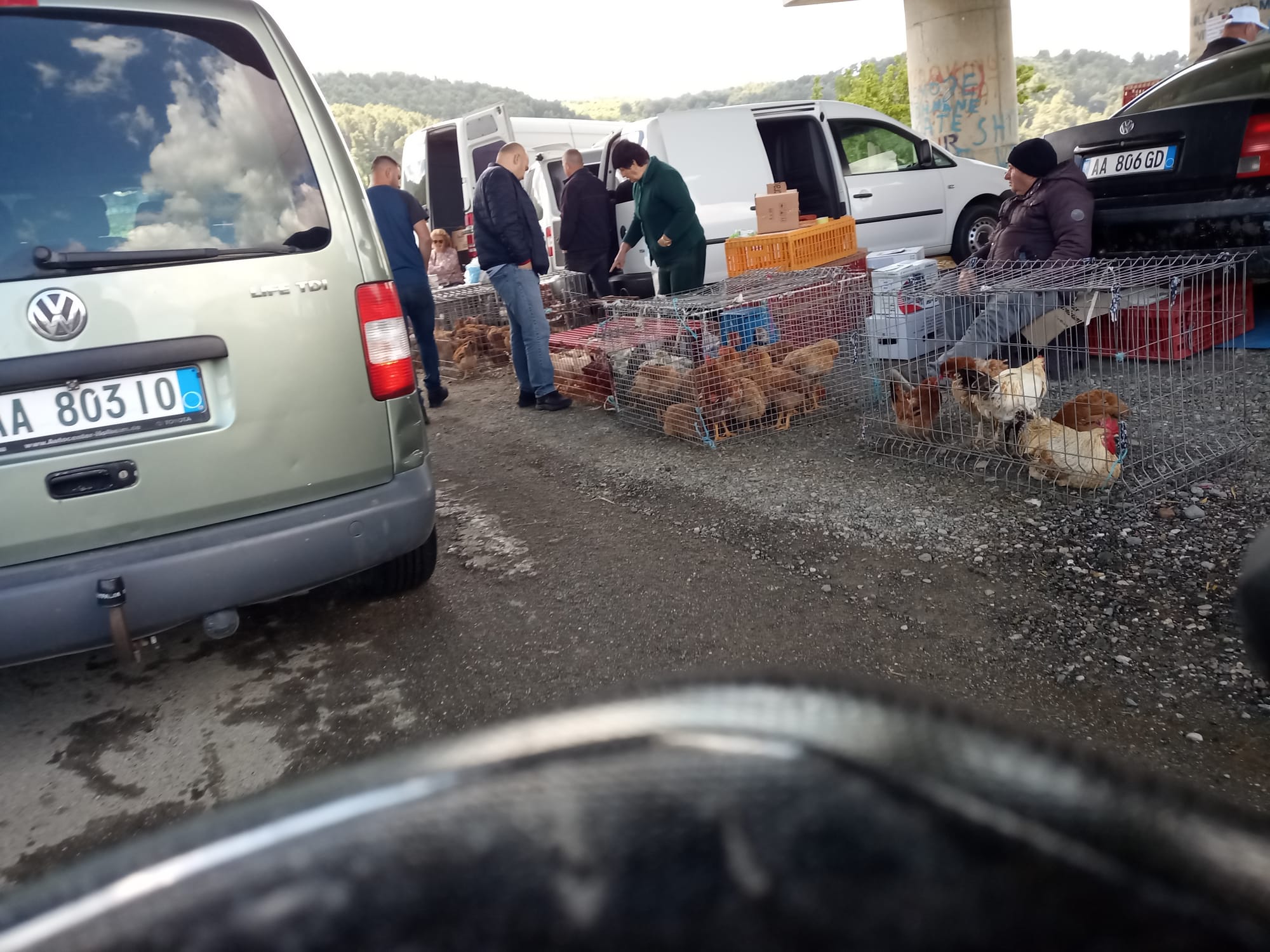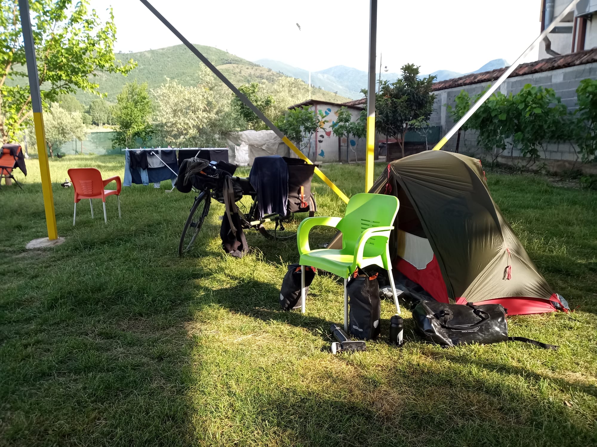 Am Ende der Baustelle suchte ich das erste Café, voll durchnässt, auf. Das Regenradar meinte, es solle heute nur noch vereinzelt regnen, und so brach ich nach einer Cola wieder auf. Leider stimmte die Vorhersage nicht, und so regnete es bis zum Mittagessen durch. Bis dahin war einiges an Verkehr unterwegs, und ich machte nur zwei kurze Pausen für einen Müsliriegel. Der noch nicht ausgebaute Teil hatte den gesamten Tag in Albanien einen Streifen im Asphalt, der hin und wieder nicht gut verfüllt war. So bin ich irgendwann unaufmerksam in diesem hängen geblieben. Um nicht in den Verkehr zu fallen, bin ich gegen die Wand gefahren. Am Arm leicht geblutet, merkte ich erst später, und eine angeschrammte Bremse ist nicht mehr passiert.