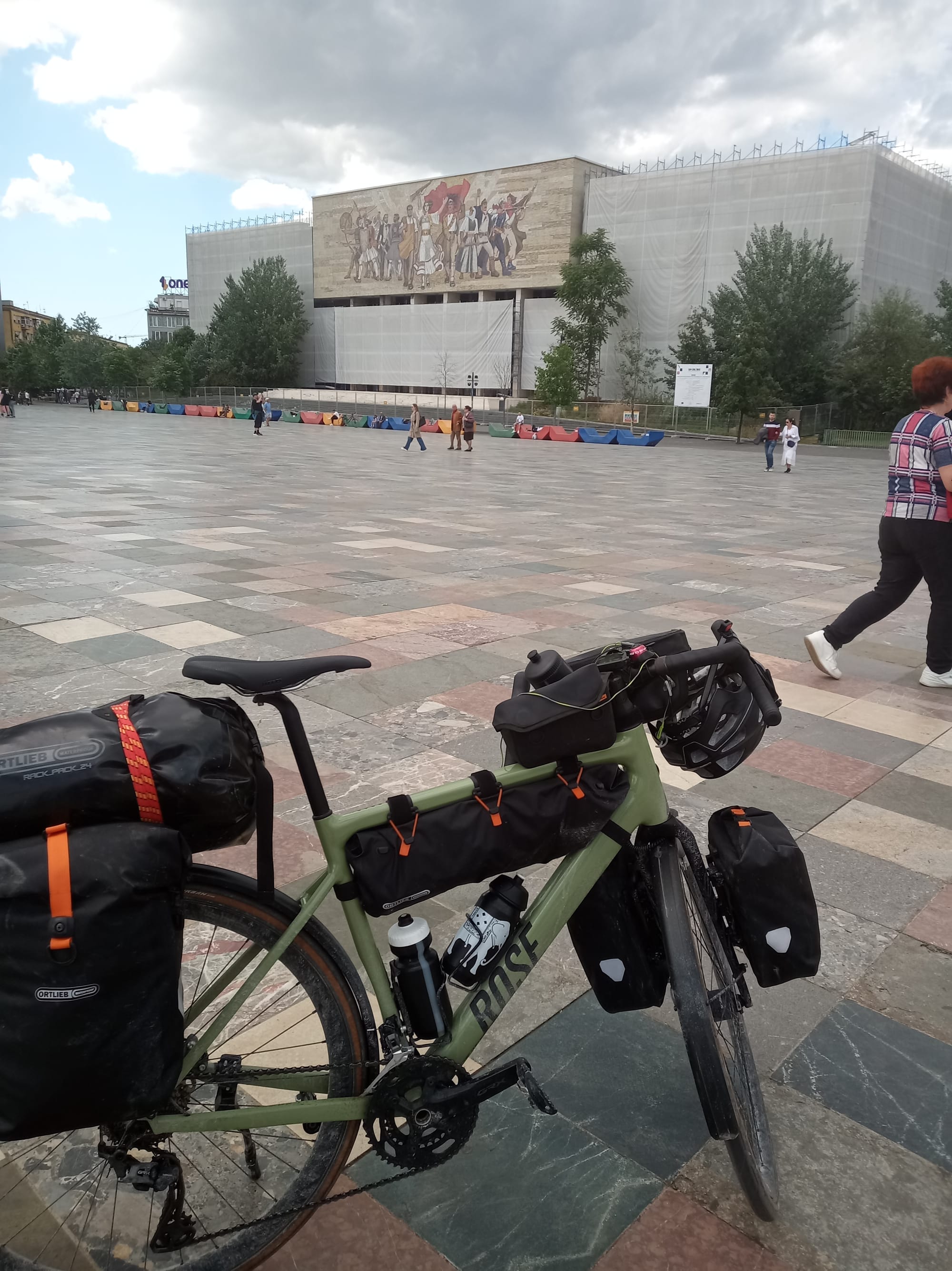 Die letzten 20 km ging es auf einer Schnellstraße hinein nach Tirana. Da Sonntag war, waren kaum LKWs unterwegs. Die Straße wurde breiter, aber es wurden auch mehr Zebrastreifen, weswegen der Verkehr langsamer wurde. Mit Musik war es erträglich. Der letzte Kilometer war auf einer schönen Allee mit Fahrradweg. Auf dem Zentralen Platz traf ich noch zwei frische Senioren, die eine Adria-Rundtour mit dem Fahrrad machen. Noch kurz Fotos machen und dann musste ich noch ein öffentliches WLAN im Burger King finden, um mein Apartment zu kontaktieren.