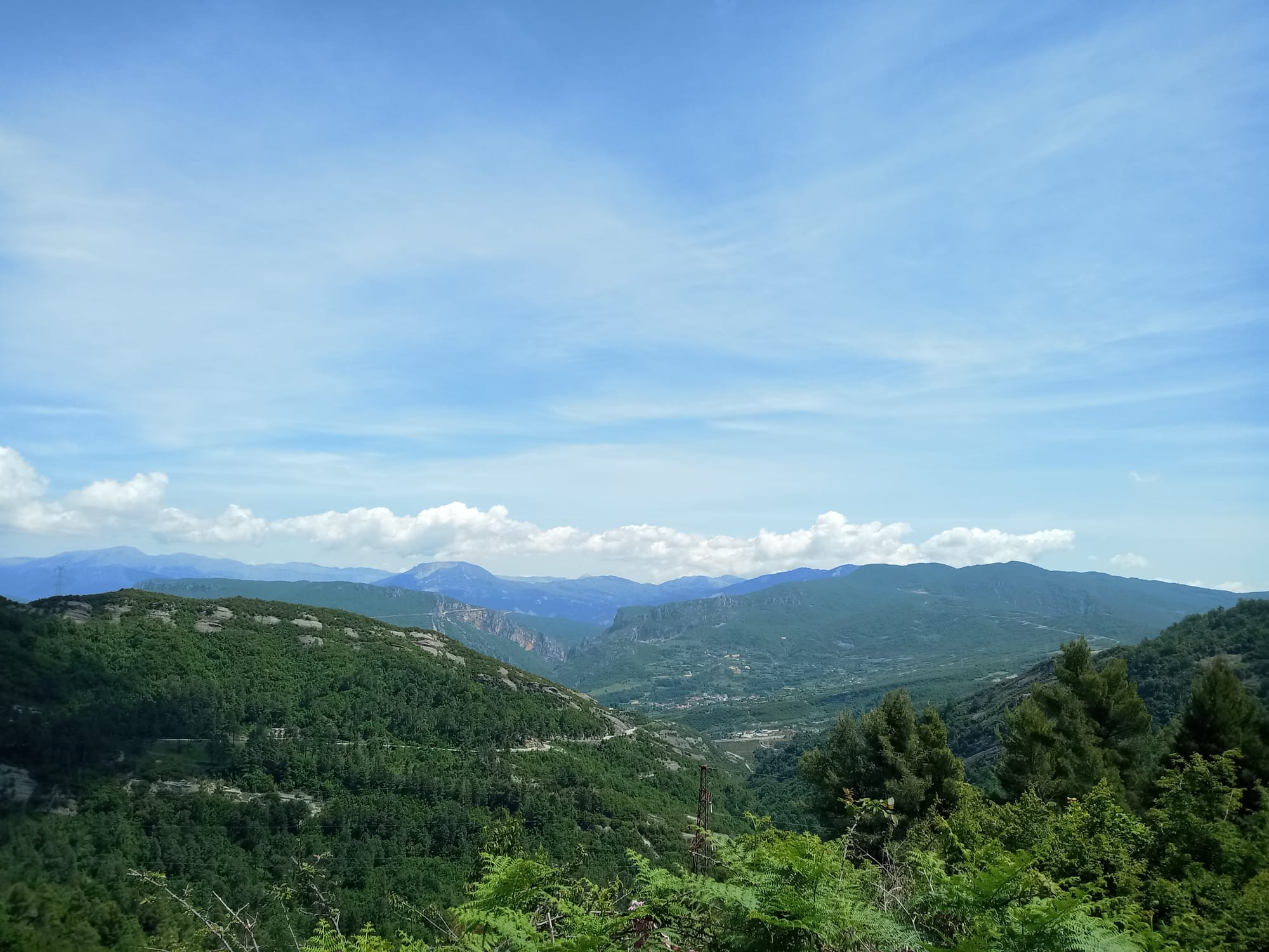 So ging es 13 km nur bergauf, aber der Ausblick oben war super. Auch auf einen 2400 m hohen, schneebedeckten Berg. Dort machte ich auch eine Pause und traf auf den Autor von Albanien.ch, einem Blog über Albanien seit dreißig Jahren. Er machte auf der Route ein paar Bilder und bei der Abfahrt auch von mir 😄. Außerdem gab mir auch Tipps, wie ich weiterfahren könnte, denn meine geplante morgige Route soll sehr verkehrsreich sein. Leider passte die Alternative nicht in meinen Zeitplan nach Griechenland. Zudem noch einen Tipp, den Verkehr durch Elbasan zu vermeiden. Die Passstraße trifft an einem Kreisverkehr auf den Verkehr des Autobahnendes.