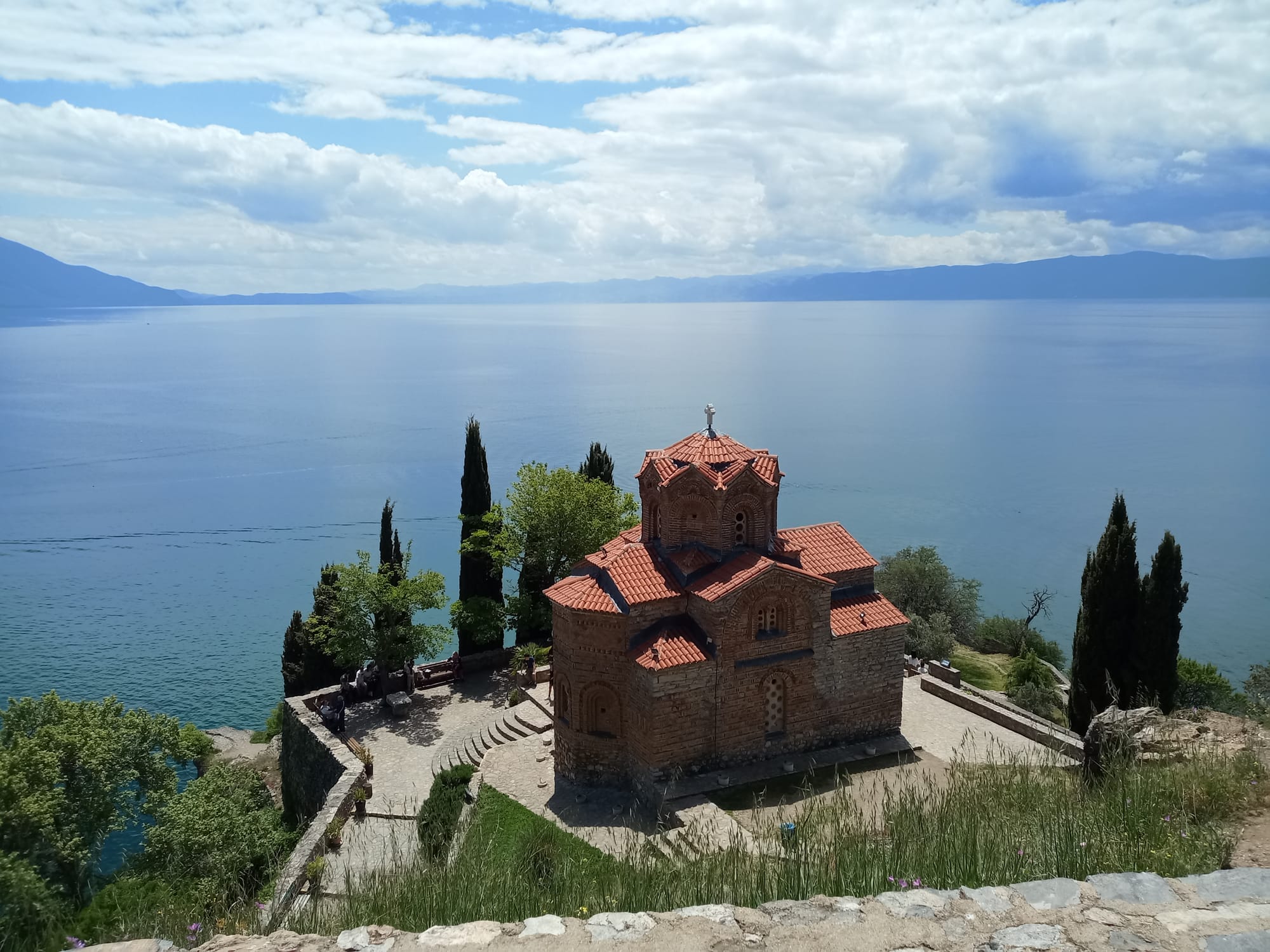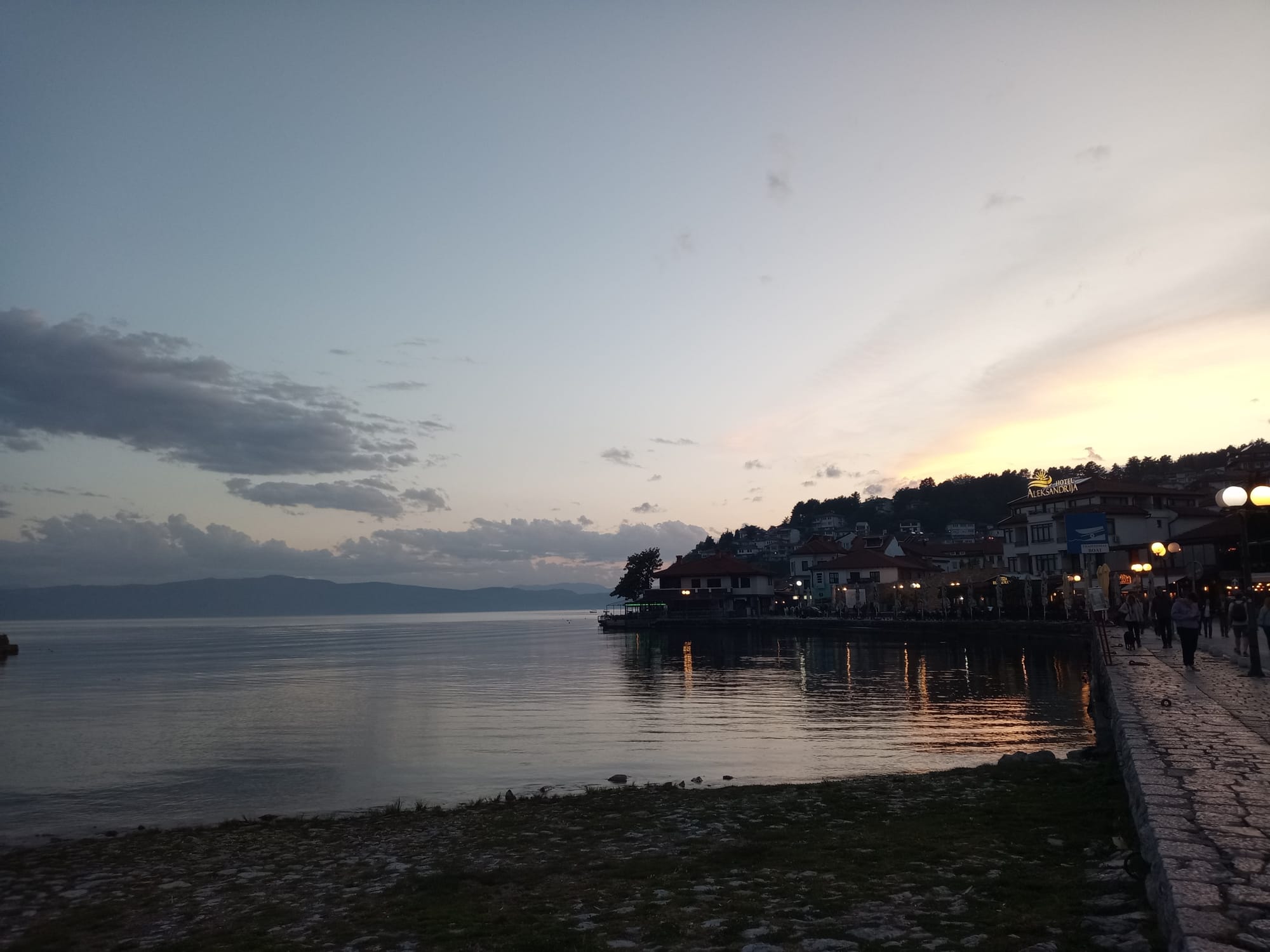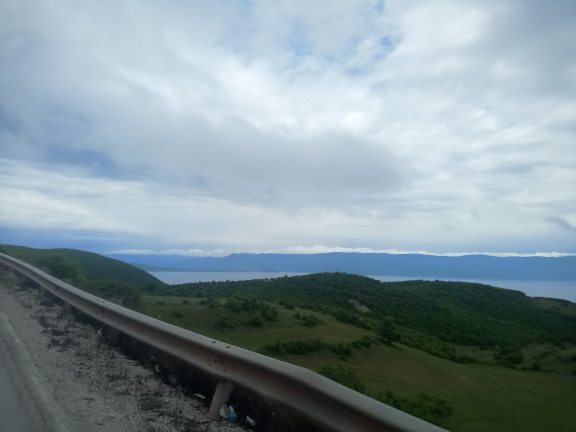 Nach dem Essen ging es dann noch 8 Kilometer steil bergauf zur Grenze nach Nordmazedonien. Dort drängelte ich mich vor, aber nur weil es immer noch regnete. Ohne Stempel durfte ich sehr schnell die Grenze passieren. Ein paar Meter Abfahrt, und ich erblickte den Ohrid-See. Die letzten 20 Kilometer am Ufer entlang hörte es endlich auf zu regnen. Im Hostel in der Altstadt eingetroffen, half erstmal eine warme Dusche und ein guter Burger. Leider war dieser nicht sättigend genug, und so ging ich mit einem anderen Radreisenden und einem australischen Minenarbeiter die ich im Hostel kennenlernte, noch eine Nutellapizza essen in guter Gesellschaft. Danach fiel früh fix und fertig ins Bett.